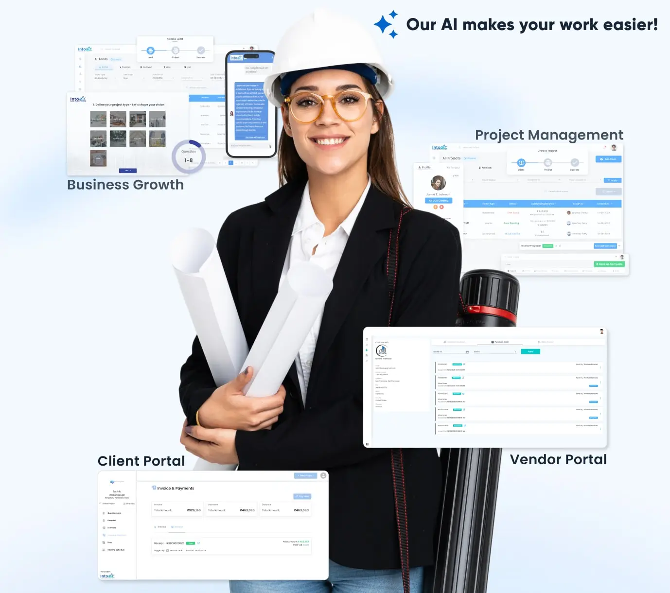 INTOAEC helps interior design firms streamline client communication, design workflows, and procurement in one platform. With built-in CRM, vendor tracking, task scheduling, and a client portal, designers can manage projects efficiently and deliver beautiful spaces on time and within budget.